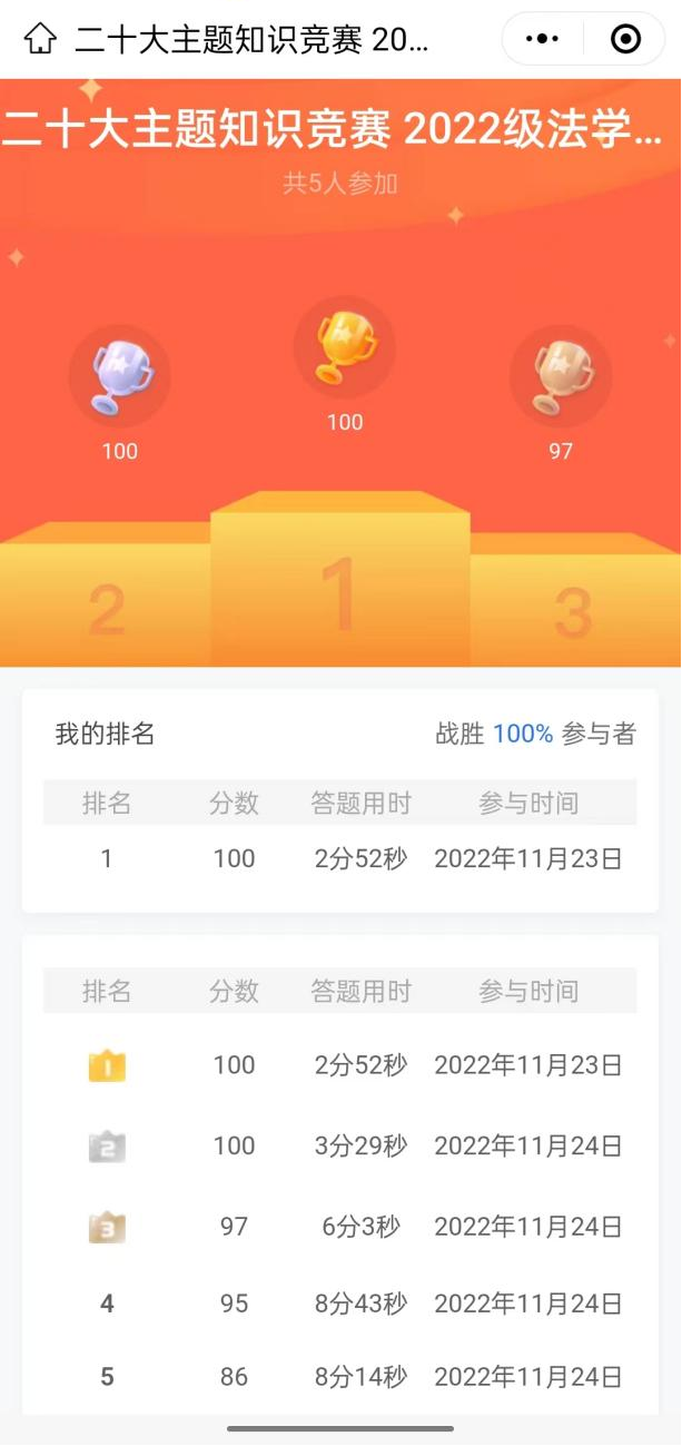 2022级法学硕士学生第一党支部开展了以“学习二十大精神”为主题的线上知识竞赛,本次竞赛题目主要以二十大报告的主要内容、要点金句为主,题量丰富、知识覆盖面广。
