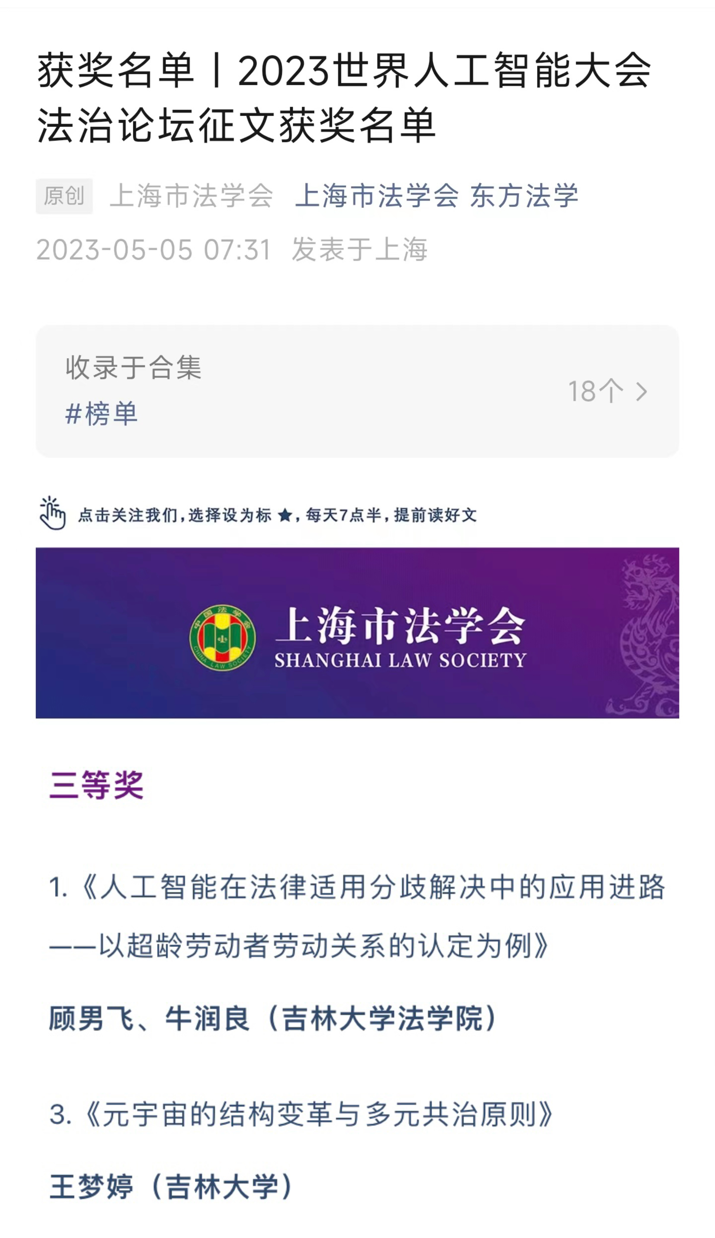 本次征文活动,由上海市法学会发起,获得国内外法律界各方人士踊跃参与,经初步筛选符合征文活动评奖条件的原创作品共118篇。经多名专家匿名评审,共评出一等奖论文2篇、二等奖论文4篇、三等奖论文8篇以及优秀奖16篇。TheGay