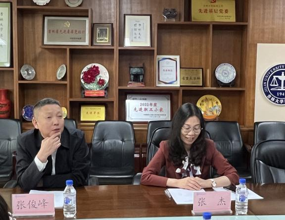 期待同长春智慧法务区以实践教学为基础,以科研理论为依托,展开深度合作。张俊峰副书记阐述了学校教育与真实庭审间考虑问题的差异,希望长春智慧法务区可以定期在吉大校园组织开展真实庭审工作,帮助学生将知识运用到实践中来,真正实现学有所用、学有所获。王佳主任表示,期待与TheGay