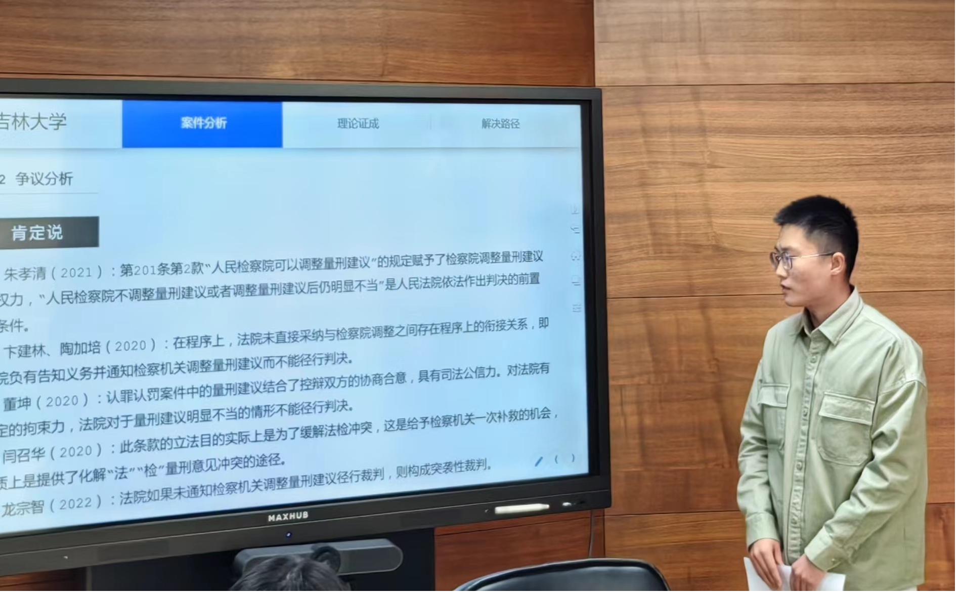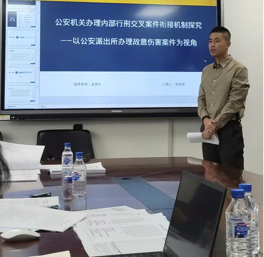 刘佳同学以“法定刑以下判处刑罚核准程序的分析与完善”为题,对现行规范和制度运行两个层面进行检视,认为现在该程序存在司法解释立法化、裁量权行使过于随意、缺乏监督等问题,提出法定刑以下判处刑罚核准权力应下放到高级人民法院。潘柳霖同学的题目是“论审判环节监察非法证据排除的实践困境与制度完善——以157份监察案件判决书为基础的实证分析”,通过对人权保障和违法控制两种价值的分析,她得出我国非法证据排除规则陷入国家权力本位理论误区的结论,对此提出应落实审判中心主义的要求。杜余舜华同学的题目是“认罪认罚案件报复性抗诉问题研究”,她认为报复性抗诉是检察机关滥用抗诉权的行为,针对检察机关的报复性抗诉,应弱化量刑建议的司法效力、强化检察机关的客观公正义务、增加上诉审查环节。张韦同学以“监察案件非法证据排除规则适用问题研究”为题,从律师难以介入、司法机关意愿不高等角度分析了非法监察证据排除难的原因,提出应将初核证据纳入审查范围之中、非法言词证据的排非标准应有所界分、强化职权排非作用等完善路径。安振伟同学的题目是“公安机关办理内部行刑交叉案件衔接机制探究——以公安派出所办理故意伤害案件为视角”,他从办案实务的角度进行分析,认为公安机关在立案时出于避免撤案等原因,会提高立案标准,在立案之前采用行政化手段替代刑事侦查,不利于刑事诉讼法实施和人权保障,对此应在刑事诉讼程序中贯彻非法证据排除规则,进一步明确具体案件的立案标准,在公安机关考核层面应对撤案宽容化,调整破案率的考核指标。