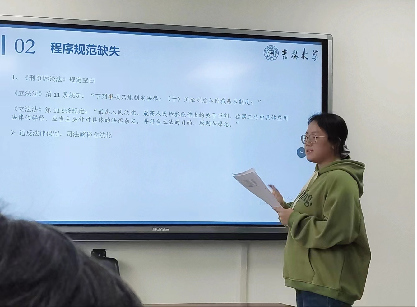 在第三小组的汇报中,牛雨霏同学以“被追诉人反悔后认罪认罚具结书适用问题研究”为题,从规范层面和实务层面分析被追诉人行使反悔权后失效具结书的适用困境,明确被追诉人反悔后失效具结书的效力,并试图构建该类具结书的适用规则;尹文婕同学的题目是“监察从宽处罚建议制度的实践检视与完善路径”,从监察从宽处罚建议制度的适用条件入手,对监察从宽处罚建议制度的实践现状予以考察,进而总结实践困境的成因,并探索该制度的完善路径;张中宝同学以“认罪认罚案件中被告人上诉权的保障——兼论被告人滥用上诉权的防范”为题,他从反面分析上诉权限制理论的弊端,又从正面论证被告人应当享有不被限制的上诉权,同时他认为检察机关“技术性抗诉”加剧了控辩之间的的不平等地位,是对被告人上诉权事实上的限制和障碍;李政泽同学的题目是“论认罪认罚案件量刑建议调整中的法院通知义务——以苏桂花开设赌场案为例”,他以苏桂花开设赌场案为引,并通过对《刑事诉讼法》第201条予以分析,认为认罪认罚案件调整量刑建议时法院应当通知检察机关,并强调法院与检察院应厘清自身定位;刘秋仪同学以“重罪案件适用认罪认罚从宽制度的困境与出路”为题,通过数据分析,认为重罪案件适用认罪认罚从宽制度的比例较低、实施细则不够具体、量刑幅度不够明确,从而建议精准量刑建议;赵月同学的题目是“认罪认罚从宽制度下无罪辩护的保障——庭审程序转化问题研究”,她认为审前程序检察机关主导认罪认罚、辩方参与认罪认罚协商程度保障不足、协商过程缺少监督机制,因而有必要在认罪认罚从宽制度下对无罪辩护的庭审程序予以保障。