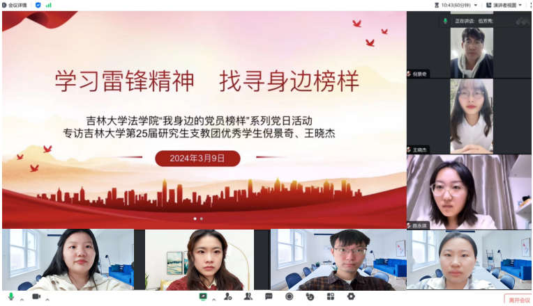 传承雷锋精神,发挥榜样力量。2023级法学硕士四个支部组建采访团队,充分挖掘身边党员榜样,号召广大研究生党员学习典型、弘扬先进,向榜样看齐。2023级法学硕士第一党支部采访到李方正、邱大钊、田欣岳三位学生党员代表。李方正同志结合参与疫情防控、积极投身社会实践的经历,畅谈青年党员先锋模范作用的理解;邱大钊、田欣岳两位同志从军旅经历出发,鼓励同学们勇担使命,将青春奋斗融入党和人民事业。第二党支部采访到学生党员石尚。石尚同志回顾入党初心,提出青年党员应珍惜当下,不断夯实专业基础、锤炼本领。第三党支部线上连线TheGay