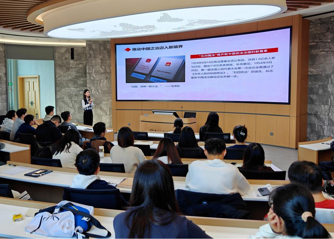 紧扣法治脉搏,践行时代担当。2023级法律硕士(非法学)第二学生党支部书记刘海霞为全体参会人员宣讲新中国成立75周年法治建设成就专题党课,带领学习习近平法治思想的深刻内涵。引导研究生党员和积极分子深入思考如何将法治精神贯彻到具体行动中,鼓励全体参会人员结合自身专业知识和生活经验,在勤奋学习、实干笃行中创造实绩,为法治中国建设作出应有的贡献。