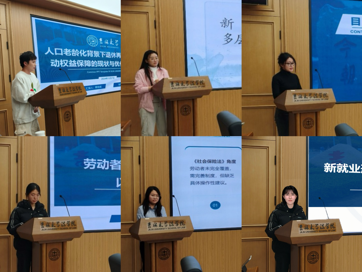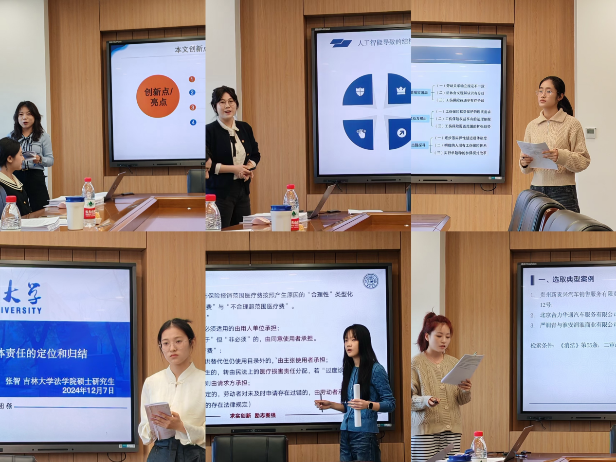 房健航同学以“平台经济中网约工劳动关系认定困境之成因与破解——基于外卖行业的考察”为题,李珊珊同学以“人工智能时代的劳动法法典化:挑战与回应”为题,汪格亦同学以“超龄劳动者工伤保险权益的实现路径”为题,王艺潞同学以“超出工伤保险报销范围医疗费承担主体探析”为题,张智同学以“‘不完全劳动关系’中用工主体责任的定位和归结”为题,范伊乔同学以“消法中惩罚性赔偿的法律适用”为题进行汇报。