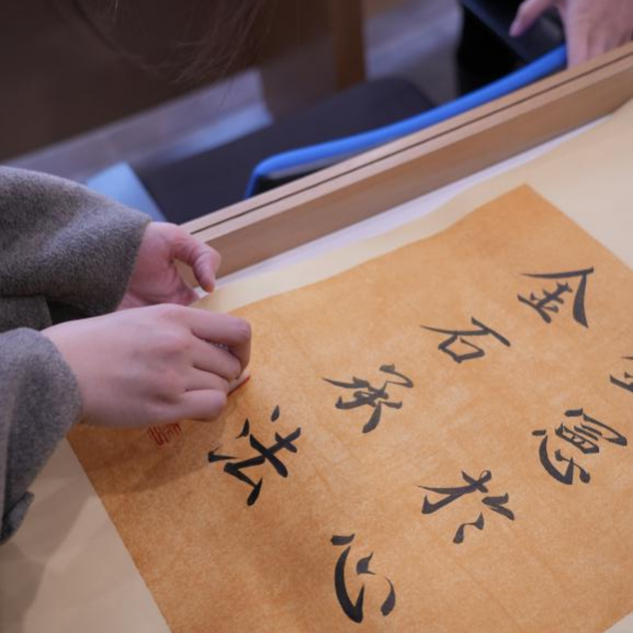 在选题拓印与篆刻创作环节,同学们按兴趣自由组队,选取案台上“公平正义”“铭宪于心”“法治同行” 等宪法标语模板;选定心仪的标语后,大家迅速进入状态,在工作人员的巡回指导下,先用笔轻轻将字体拓印到印石上,再手持刻刀小心翼翼地雕琢。