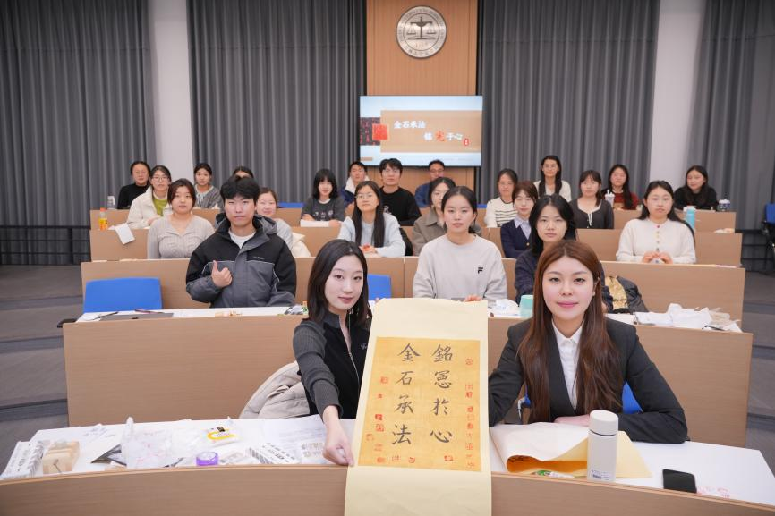 在成果展示与合影留念环节,各位同学怀着满满的成就感,有序来到前方的 “金石承法,铭宪于心” 书法作品纸前。当蘸满红色印泥的印章稳稳落下,一个个古朴苍劲的篆字在洁白的宣纸上绽放,瞬间定格下专属的法治记忆。