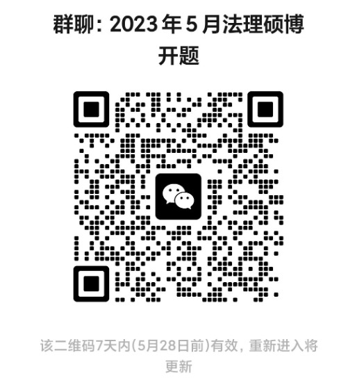 法学理论专业硕、博毕业论文开题拟于5月25日(周四)、5月26日(周五)上午8:30举行。请法学理论专业(含法学理论专业导师名下指导的法律硕士)参加论文开题的同学提前加入微信群。