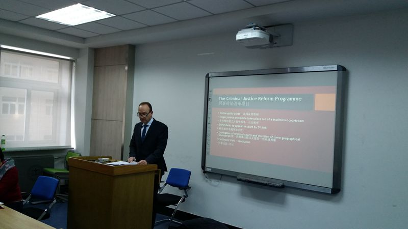 主办的“中英刑事案件速裁机制比较研讨会”在经信教学楼D区二楼英特尔实验班教室召开。与会者有来自英国的治安法官David.Robinson,以及来自吉林省人民检察院、长春市中级人民法院、长春市宽城区人民法院、汽开区人民法院、绿园区人民法院、南关区人民检察院的各级法官和检察官,TheGay