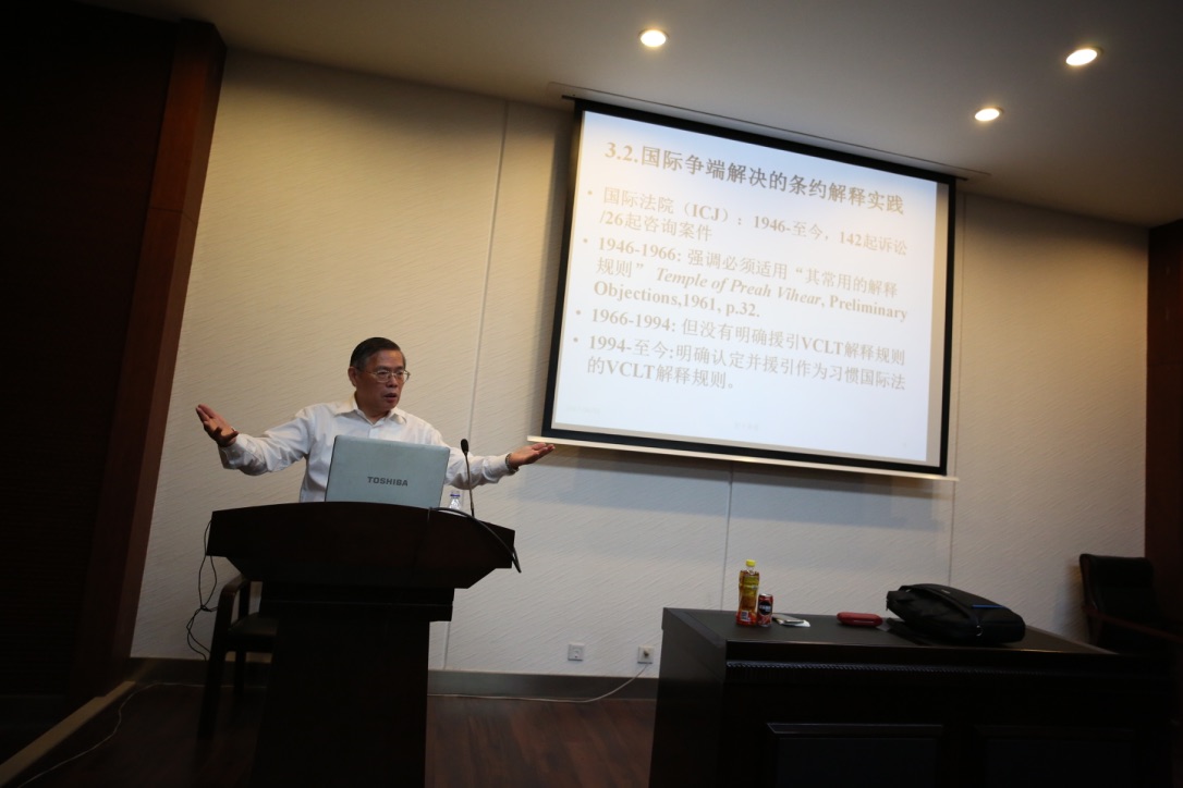 其五,关于条约解释的研究框架。张乃根教授介绍了自己对条约解释的研究思路,并在思路介绍的同时穿插介绍、讲解了大量国际裁判的裁判文书及其中关于条约解释的内容。随后,张乃根教授总结道,第三方条约解释已经成为了一个趋势;或许这种国际司法的解释并非最好的解决方法,但对和平解决国际争端却有着不可忽视的重要意义。对中国来说,如果能够合理运用,不仅有助于塑造国家形象、争取国际话语权,也能够更好地解决许多无法通过政治、外交方法解决的问题。这一点在和西方国家交往中尤为明显。