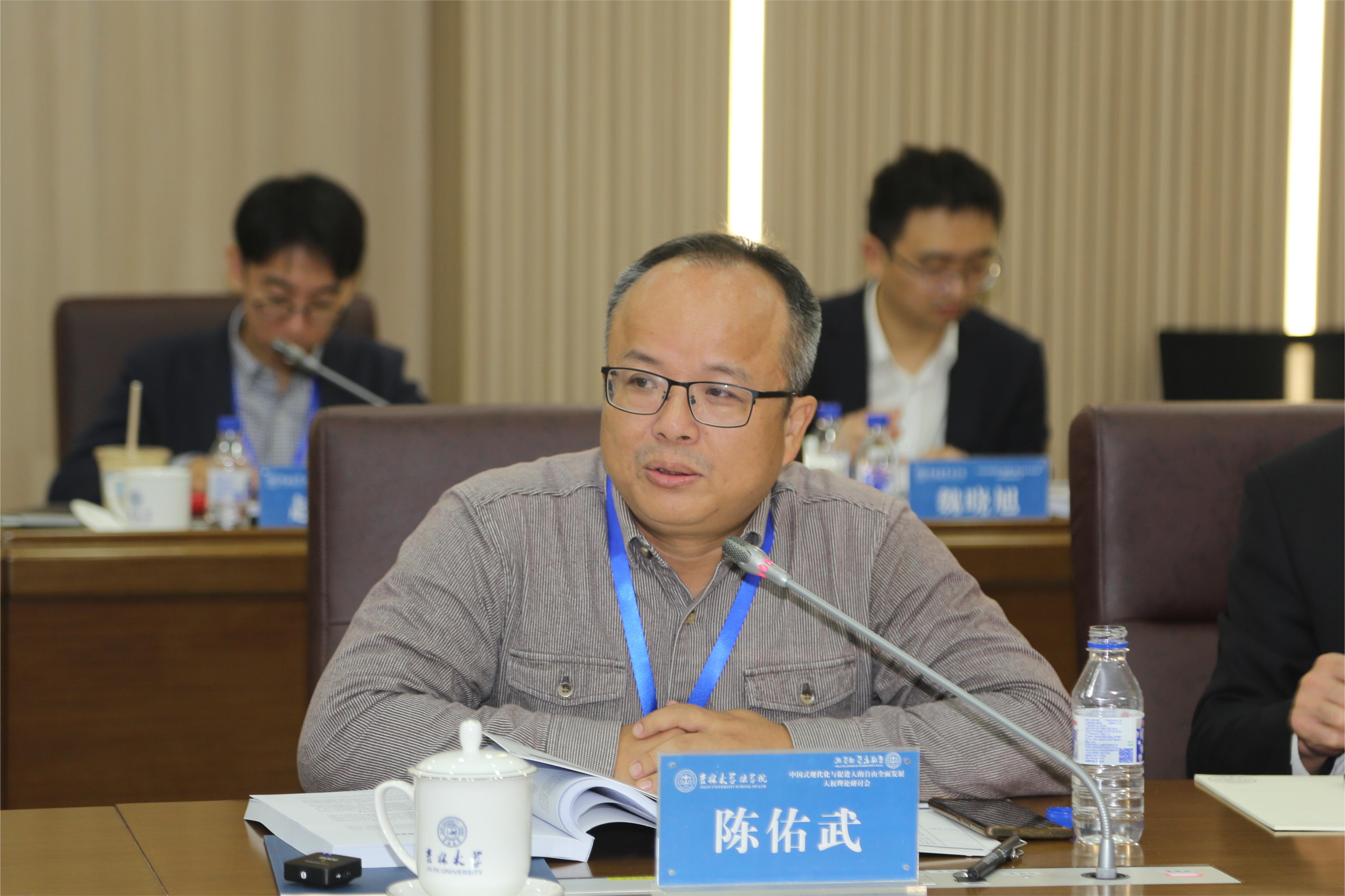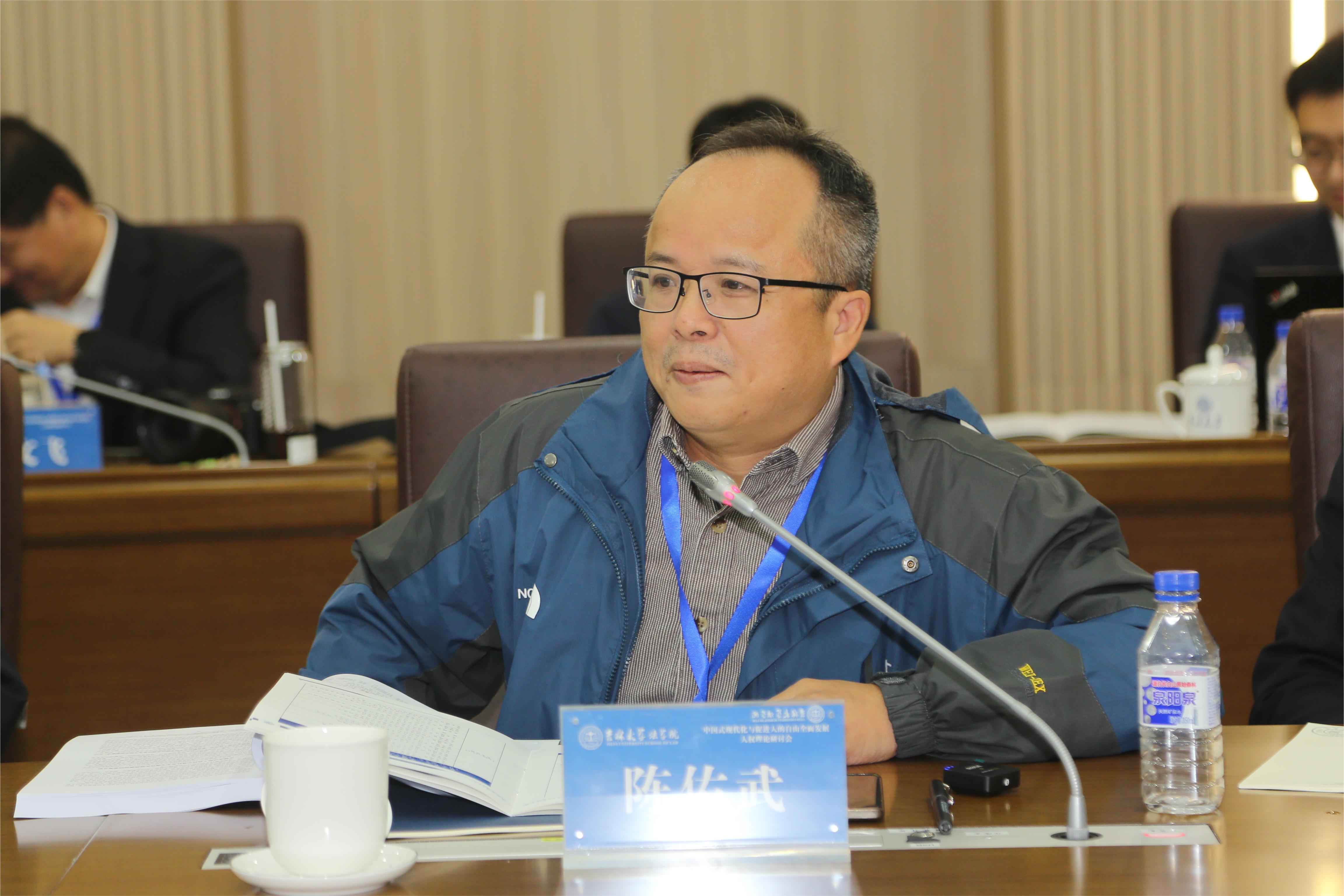 在评议环节,陈佑武教授针对本单元发言从三个方面展开评议:第一,关于民主与人权的关系,陈佑武教授指出,作为人权学者,必须关注民主问题;第二,关于数字人权,陈佑武教授认为,应当根据国家社会发展的形势,研究数字人权理论,培育在数字领域有所作为的人才;第三,关于人权的特殊性,陈佑武教授提出,应当认识到人权保障领域的特殊性,将“两个结合”中的“第二个结合”应用到人权领域中。