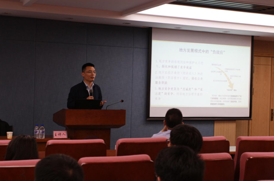 周尚君教授首先从“重新认识地方”这个问题开始引入,提出地方绝非中央政策的单一执行者,而是地方改革和社会治理的主要承担者。周尚君教授从财政压力、晋升压力和稳定压力三个方面着手分析传统压力型治理模式表现出的“负效应”。然后通过对地方法治竞争格局的实证分析,他认为被动或主动的制度调试将成为地方改革的必然选择,并提出掌握规则重构主动权、赢得制度红利在未来地方竞争中的巨大优势。同时,周教授也提出了在未来地方法治竞争中将会面临的的制度约束。最后,周老师与聆听讲座的学生展开互动交流,并对同学们提出的问题的思想性和深刻性给予了高度评价。