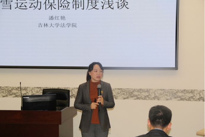 潘红艳副教授在第二分会场第二单元发表了题为《完善冰雪运动保险制度浅谈》的报告。她指出“完善冰雪运动传责任保险的路径为:单独设计和推出冰雪运动场馆责任保险;承保冰雪运动场馆设施损害、工作人员疏忽大意等引发的赔偿责任”。