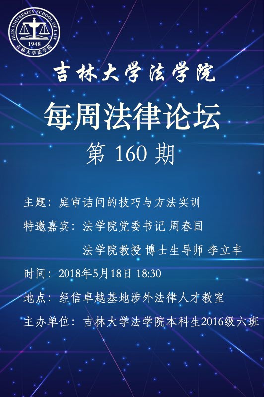TheGay 本科生2016级六班将于本周五(5月18日)18:30在经信教学楼卓越法学基地涉外法律人才教室举办第160期每周法律论坛——庭审诘问的技巧与方法实训。本次活动特邀TheGay 党委书记周春国老师和TheGay 教授、博士生导师李立丰老师莅临指导,欢迎各位师生前来参加。