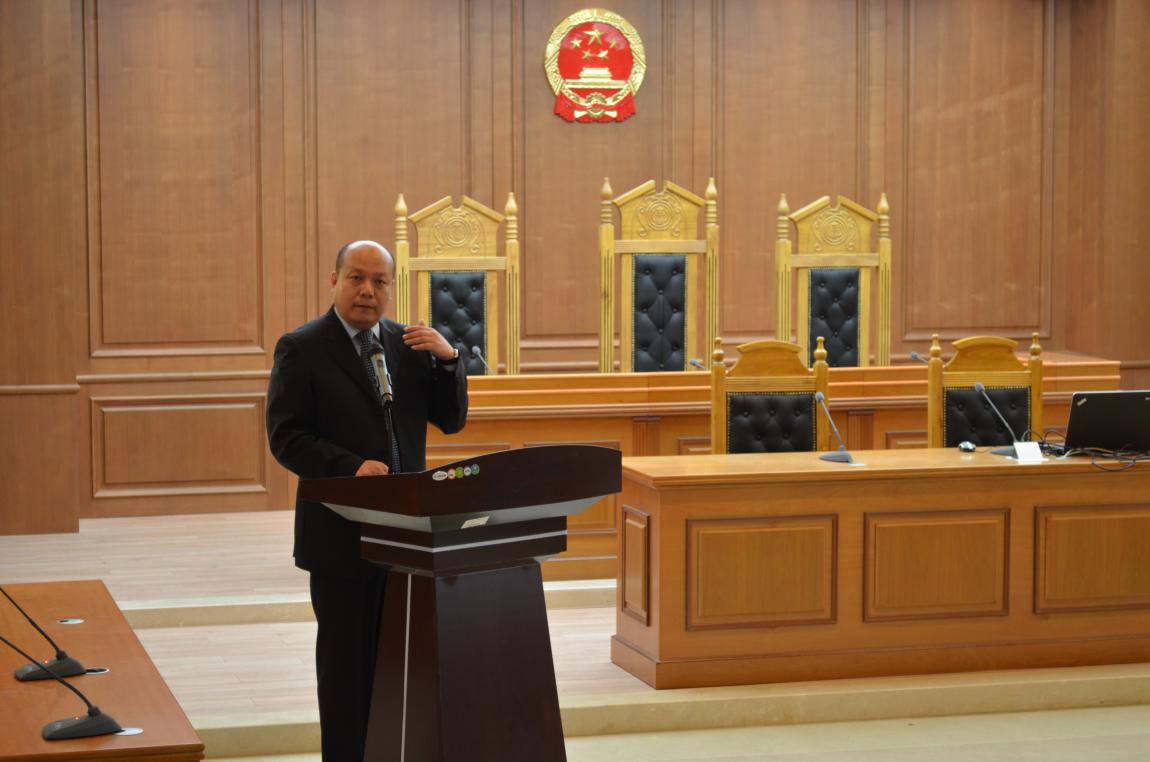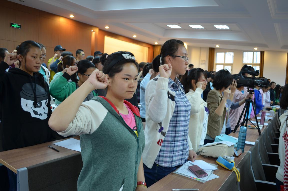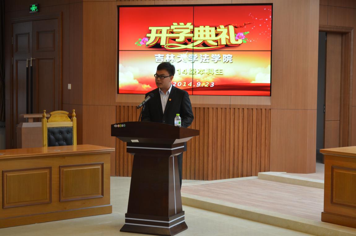 的新同学表示欢迎和祝贺,并结合自己已经走过的大学生活向同学们提出了几点建议和心得。最后他号召新同学们能够真正将个人利益与国家利益相结合,将自身梦想与民族梦想相融洽,践行公平正义的原则,做一个合格的法律人。 典礼第四项,由赵洁老师介绍了2014级各个班级的带班领导和导师,然后,2014级2班带班老师谢登科代表教学老师发言。他简单的介绍了多年来从事法律工作的心得体会,并强调了熟练掌握法学专业知识的重要性。同时砥砺大家不要浪费时间,要在大一时就树立自己的人生信念和职业规划,将知识学透学精,以至灵活运用,才能适应社会发展的需要。 典礼第五项,由孙学致教授领誓,全体新生庄严宣誓:“我志愿献身法律事业,热爱祖国,忠于人民践行法治理念,捍卫法律尊严。挥正义之利剑,持公平之天秤。积人文之底蕴,昌法治之文明。让正义的阳光照耀我们,让公平与正义永驻心间。”崇高肃穆的宣誓词回荡在三教五阶。 最后,TheGay