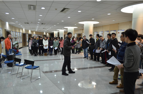 6点15分左右,大部分参与人员就已经陆续到来,党员们积极务实的态度可见一斑。骆旷达老师也亲临现场,与大家并肩奋斗。6点30分,在完成了签到及分发歌词后,排练正式开始。为了提供专业的指导,学院专门请来了艺术学院音乐系的黄老师为合唱队做专门培训。