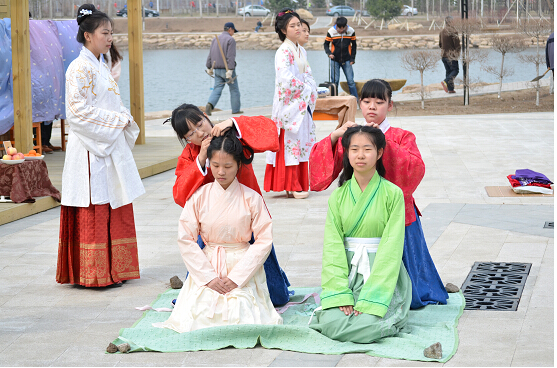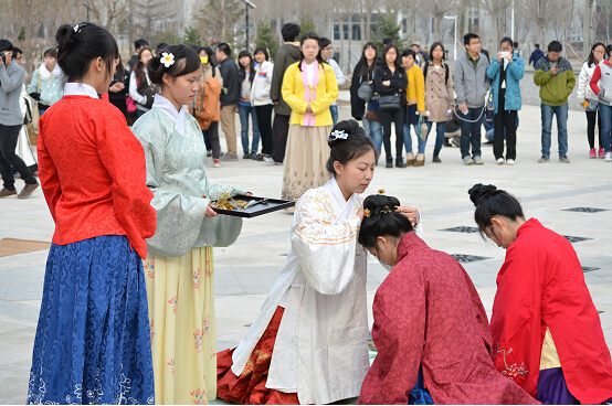 2015年4月19日下午一点半,伴着春日里微醺的暖风,落英缤纷,碧水微皱,白露汉服社的同学身着汉服,举行了一场别开生面的传统成年礼活动——女子笄礼。