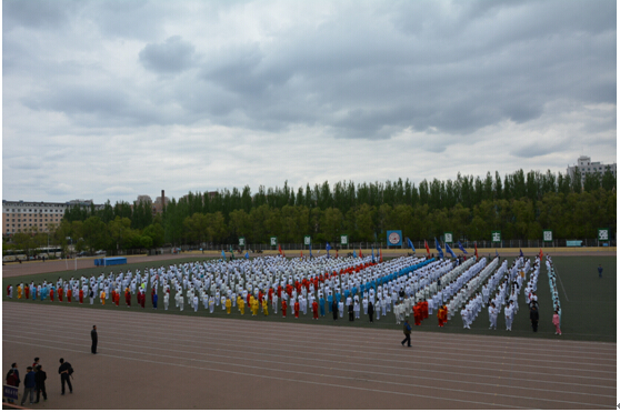 所用学院预检完毕后,由学校统一安排站位,各院以30人为一路纵队,联合成了一个大方阵。千余人的方阵气场,加上各学院不同颜色的武术表演服、不同的彩旗,在体育场形成了一道亮丽的风景线。当真是美不胜收。