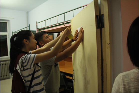 生管会徐润主任、王天玥秘书长和生管会的同学开始清扫和布置2015级新生寝室,为新生寝室张贴门楣、门贴和床位标签。生管会一行20余名同学首先到大学城二公寓进行男生寝室的清洁和布置,然后前往大学城三公寓对女生寝室进行清洁和布置。经过两个多小时的辛勤劳动,生管会的同学们将一间间寝室布置得整洁一新,为即将入住的新同学营造良好的环境。与往年有所不同的是,二班、三班、四班和五班的新生班主任也来到了大学城公寓,一起对新生寝室进行了打扫。