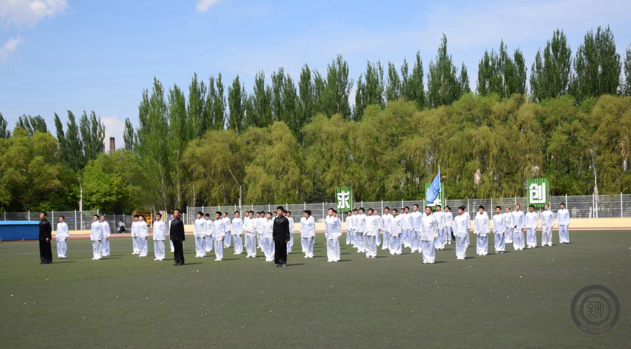 的院旗随风飘扬,队员们做出标准而整齐划一的动作,或出拳,或抬腿,或深蹲,或起跳……经过将近一个月的艰苦训练,每一式的动作队员们都烂熟于心。音乐结束,队员们又迅速地聚拢,恢复入场时的队形,跑步退场。