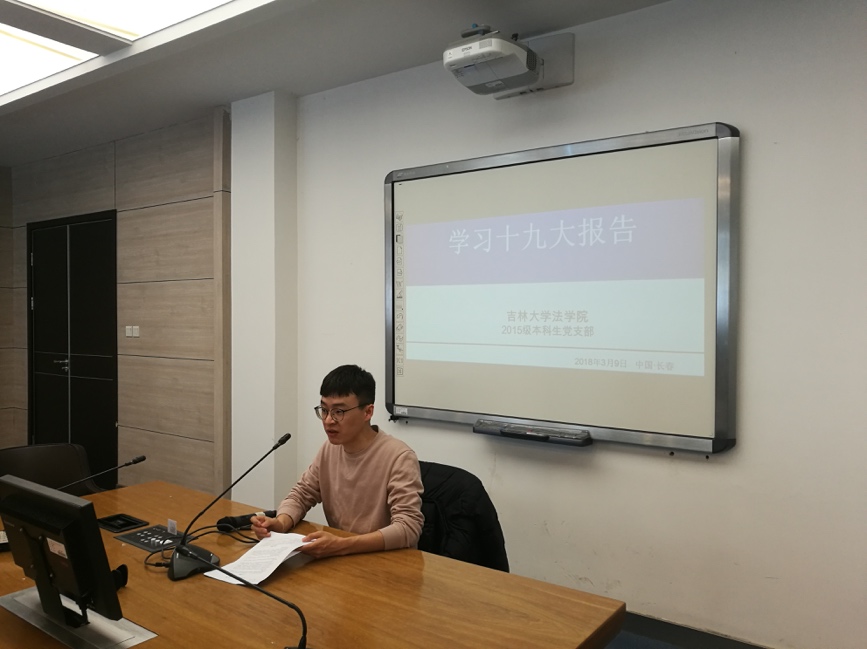 9日下午1点半, 2015级党支部组织生活会在经信教室召开。首先,2015级兼职辅导员张旭就十九大报告重点学习内容进行了发言。他通过讲述“八个明确”、“十四个坚持”,强调学生党员应当明确我党发展建设目标、了解我国新时代中国特色社会主义的基本方略。他希望党支部的各位同志牢固树立“四个意识”,即政治意识、大局意识、核心意识、看齐意识,自觉在思想上、政治上、行动上同党中央保持高度一致,对支部与个人存在的问题进行反思,并主动进行调整、纠正、校准。