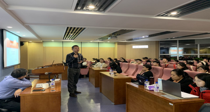 教授胡晓静老师致辞,胡老师提出本次讲座的目的是给同学们一次深入了解《公司法》修改内涵的机会,让同学们不仅从书本更从实际运用中去了解、掌握其精神实质,给同学们带来一些思维上的启发。