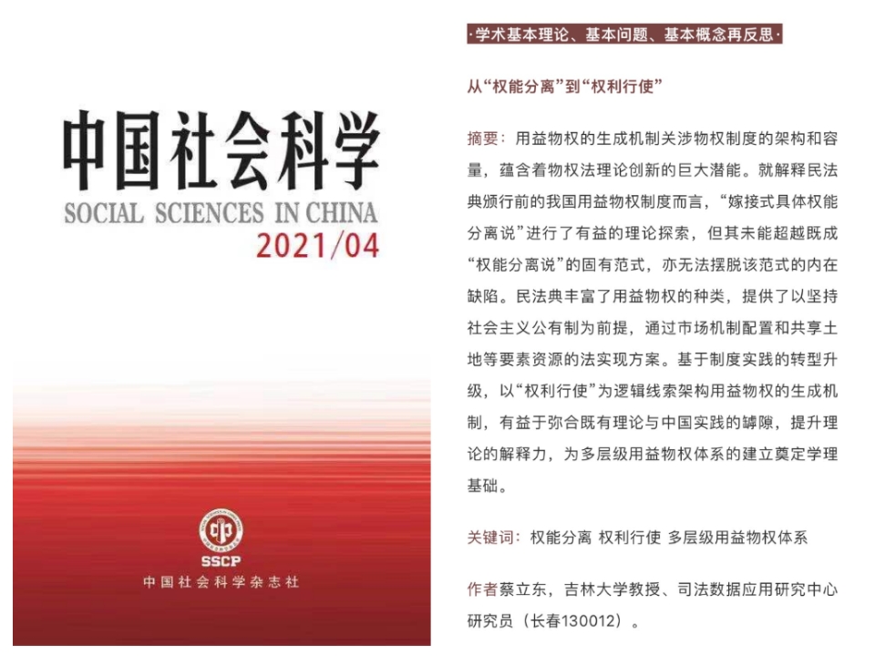司法数据应用研究中心研究员蔡立东在《中国社会科学》2021年第四期发表论文《从“权能分离”到“权利行使”》。
