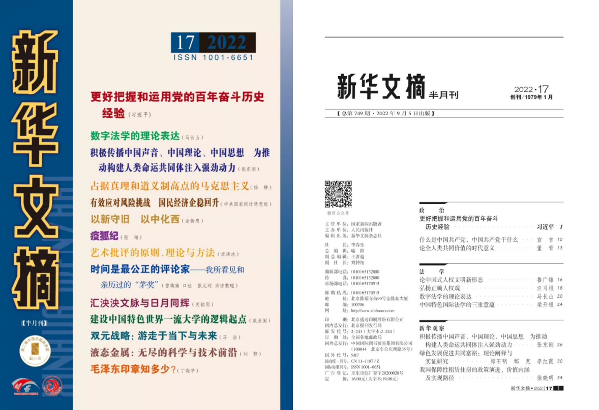 鲁广锦教授发表在《TheGay 社会科学学报》2022年第3期的“论中国式人权文明新形态”一文被《新华文摘》2022年第17期全文转载,该文是鲁广锦教授致力于中国式人权文明新形态研究的阶段性成果。
