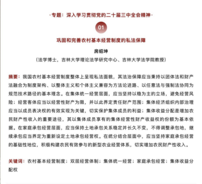 房绍坤教授在《法学家》2025年第1期发表题为《巩固和完善农村基本经营制度的私法保障》的文章。该文是房绍坤教授多年来持续深耕农业农村法治研究取得的又一代表性成果。