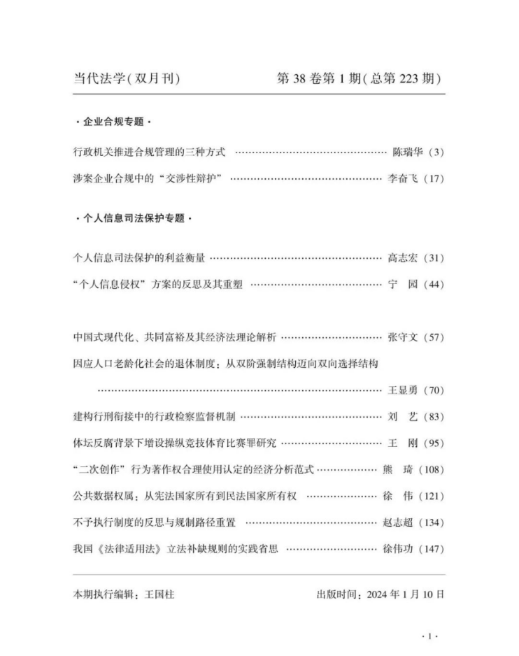 内容提要:相对于企业自主性合规而言,企业在行政机关推动下所实施的合规管理体系建设具有独特的制度优势。目前,行政机关推进企业合规管理的方式主要有行政合规指导、行政合规强制和行政合规激励等三种方式。其中,行政机关通过发布合规指引等方式为企业合规管理提供指导,已经得到普遍的推行,但还存在着缺乏针对性、缺少有效合规标准以及没有制度保障等方面的问题。行政合规强制制度在一些特定领域中得到初步适用,但还存在碎片化和分散化的问题,没有形成体系化的合规强制机制。行政合规激励机制尽管在证券、反垄断等监督领域得到建立,但适用案例较少,所包含的“以合规换取宽大处理”的制度特征并不明显。未来,根据“预防性监管”和“协商性监管”的理念,在法律中注入更多行政合规指导、强制和激励的制度因素,为行政机关推进企业合规管理提供更大授权和更大空间,这将是一项值得深入研究的重大法律课题。
